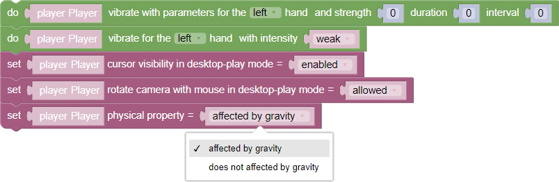 - Player subordinate/not subordinate to gravity - the parameter that sets the possibility for the player to use the physical properties of gravity, for example, to jump (default