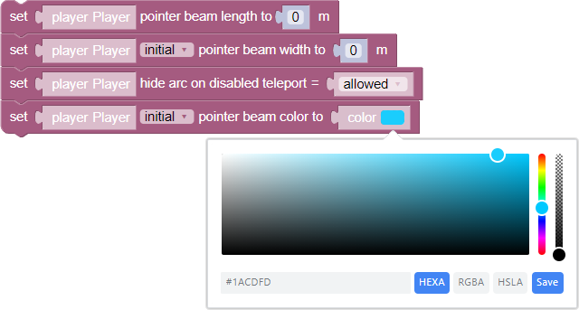 The wand beam color is a parameter that sets either the starting color of the beam or the ending color. To set the color, click on the color in the block and specify the color either in HEXA/RGBA/HSLA formats or in a palette. More about working with color