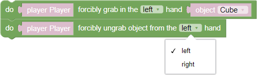 - The first function allows you to attach an object to the player. To do this, the first field specifies directly the player. In the second field, the user can select an object from a list already on the stage. And the third field, the field indicating to which hand, right or left, the object should be attached
