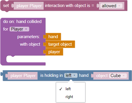 - The player is holding in the “right/left” hand “Object” - a logical block that transmits a true or false value, depending on whether the selected object is in the left or right hand of the user at the moment