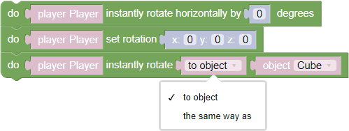 - Instant horizontal rotation - a block, the execution of which instantly turns the player in the horizontal plane (along the Y axis) in accordance with the specified rotation degree