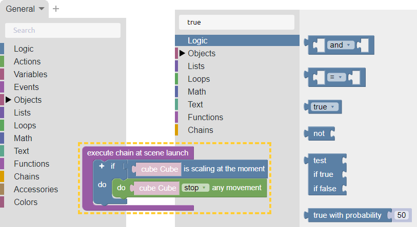 New object behaviors allow the user to more flexibly work out the logic of interaction between objects, manipulating them at a new level. As part of the new behaviors, more than 190 blocks and groups of blocks have been redesigned to make it easier to interact with them. Also, some of the blocks were abolished due to duplication of functionality. Updated block categories: