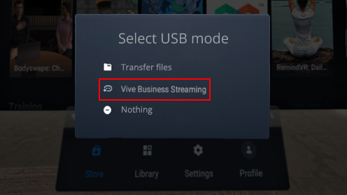 Put the headset on. You will be shown a window with the USB mode selection. Initially, the line with VIVE Business Streaming will be inactive. Wait for 5 seconds and when it is active, select