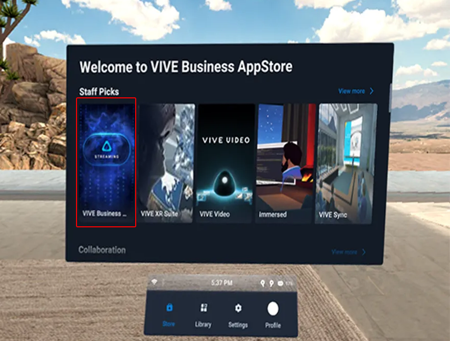 In the headset, go to the Store tab and on the first page, from the recommended apps, open VIVE Business Streaming (if this app is not in the recommended apps, use the search)