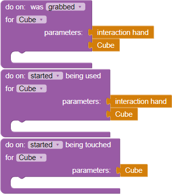 A set of universal blocks, working with the interactivity of Varwin objects and interaction with them. Object interactivity can be configured both in the 3D scene editing mode and in the Blockly logic editor