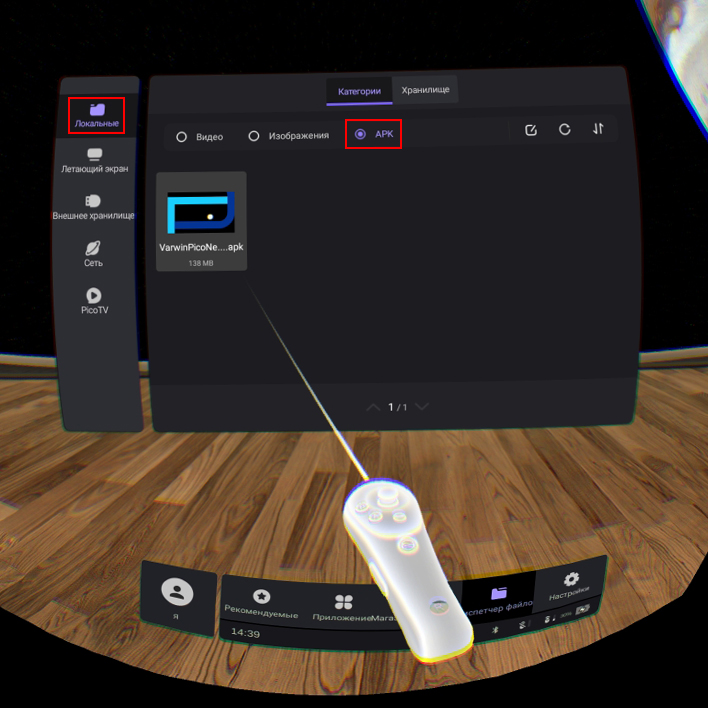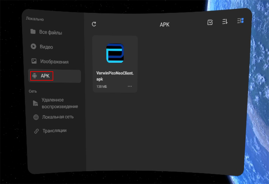 - В левом меню выберите "Локальные" и выберите сортировку по "APK". Найдите мобильный клиент Varwin с соответствующим логотипом и нажмите на него