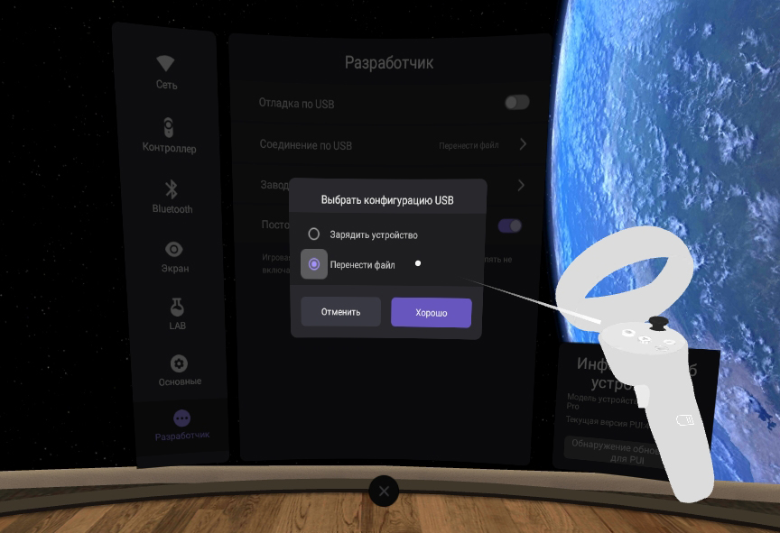 Убедитесь что в настройках шлема, в категории "Разработчик" режим USB установлен на "Перенести файл"