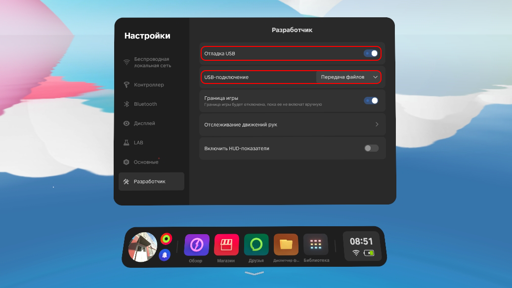 Убедитесь что в настройках шлема, в категории "Разработчик" включена "Отладка USB", а в параметре "USB-подключение" выбрано "Передача файлов"