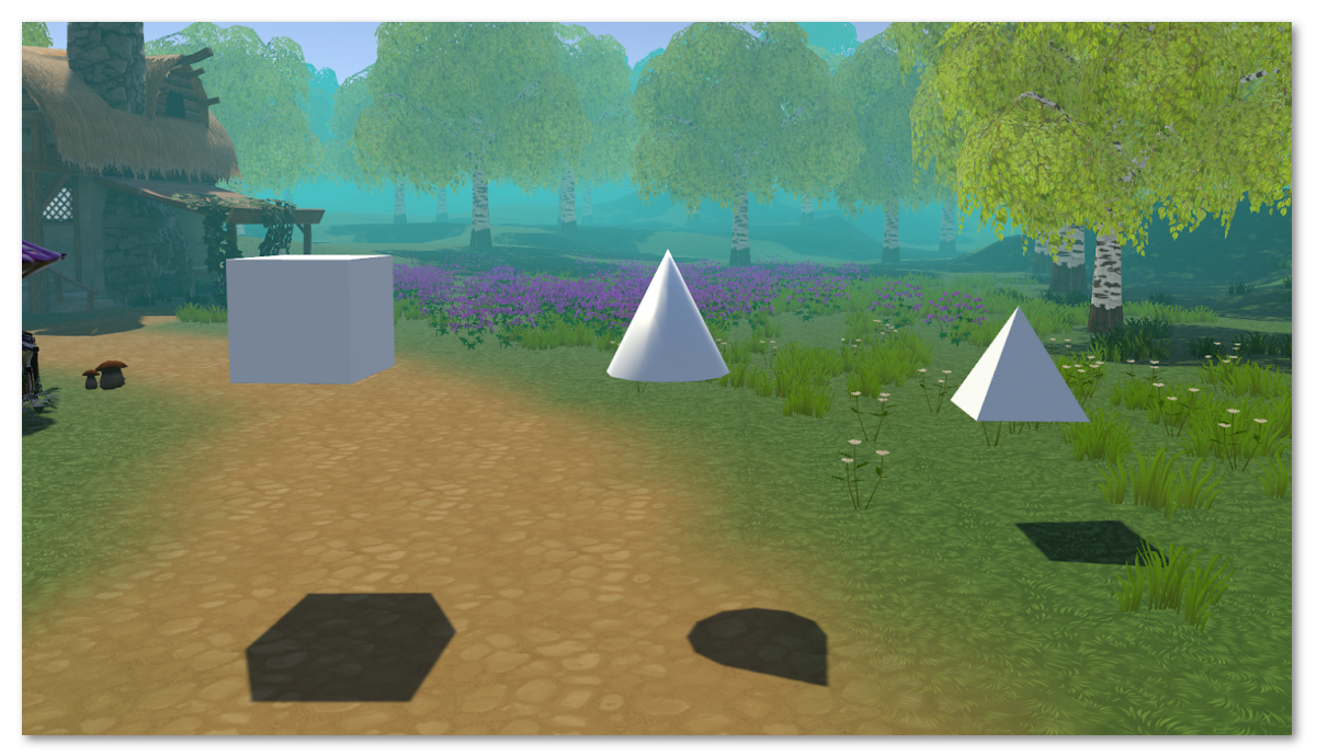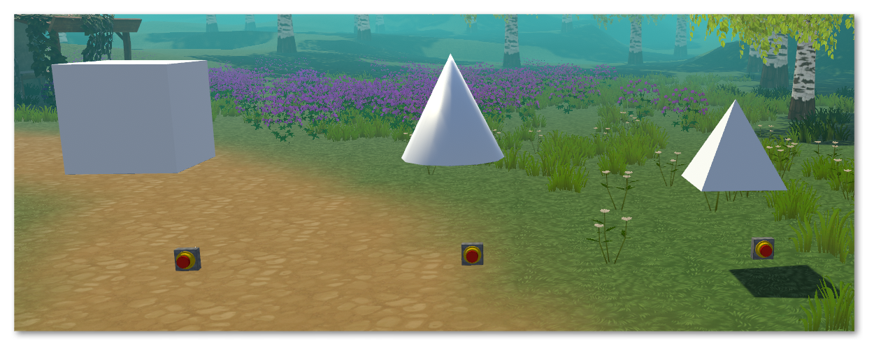- Place three objects on the scene: a cube, a cone and a pyramid. Make the objects static