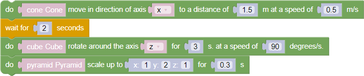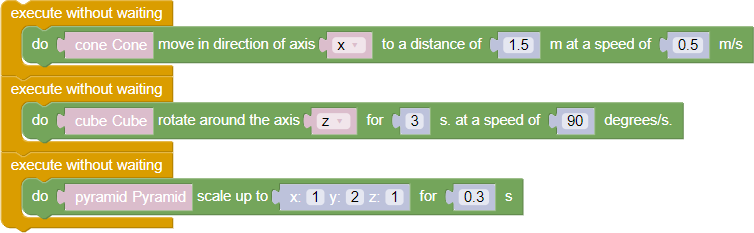 - Click on the button below the cone. The cone will be scaled along the given axis. Approach the pyramid and press the button below it - nothing happened, the cone continues to scale. This is because the sequential zoom action has not completed. To do this, press the button under the cone