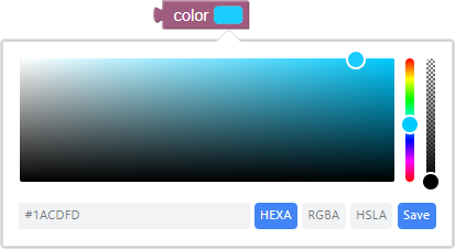 Variable block containing color parameters in HEXA, RGBA, HSLA format. When you click on the color window, a palette will open where the user can set the value of the color parameters in the previously specified formats or simply select a color by specifying it on the palette