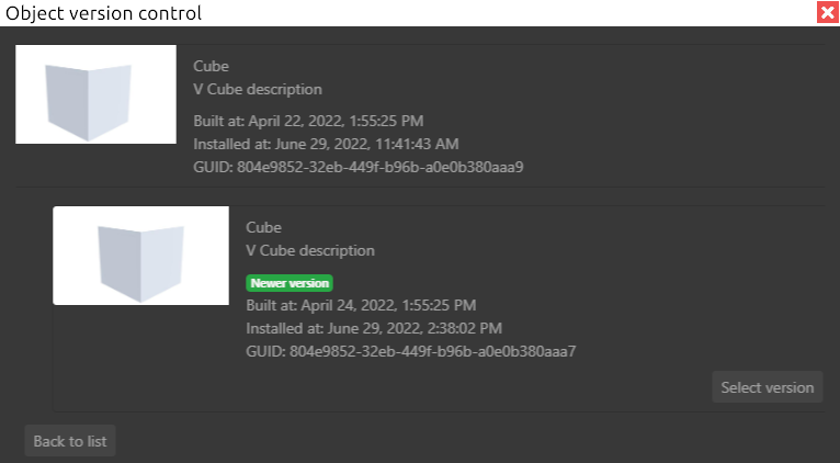 A list of object versionsshowing creationdate,date addedandGUID. The newest version has a corresponding message. Opposite each of the versions there is a button that selects this version as the main one