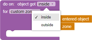 The event block triggers when the specified object enters or leaves the specified zone. The parameters include the specified object and the source, which is the selected zone with which the object interacts