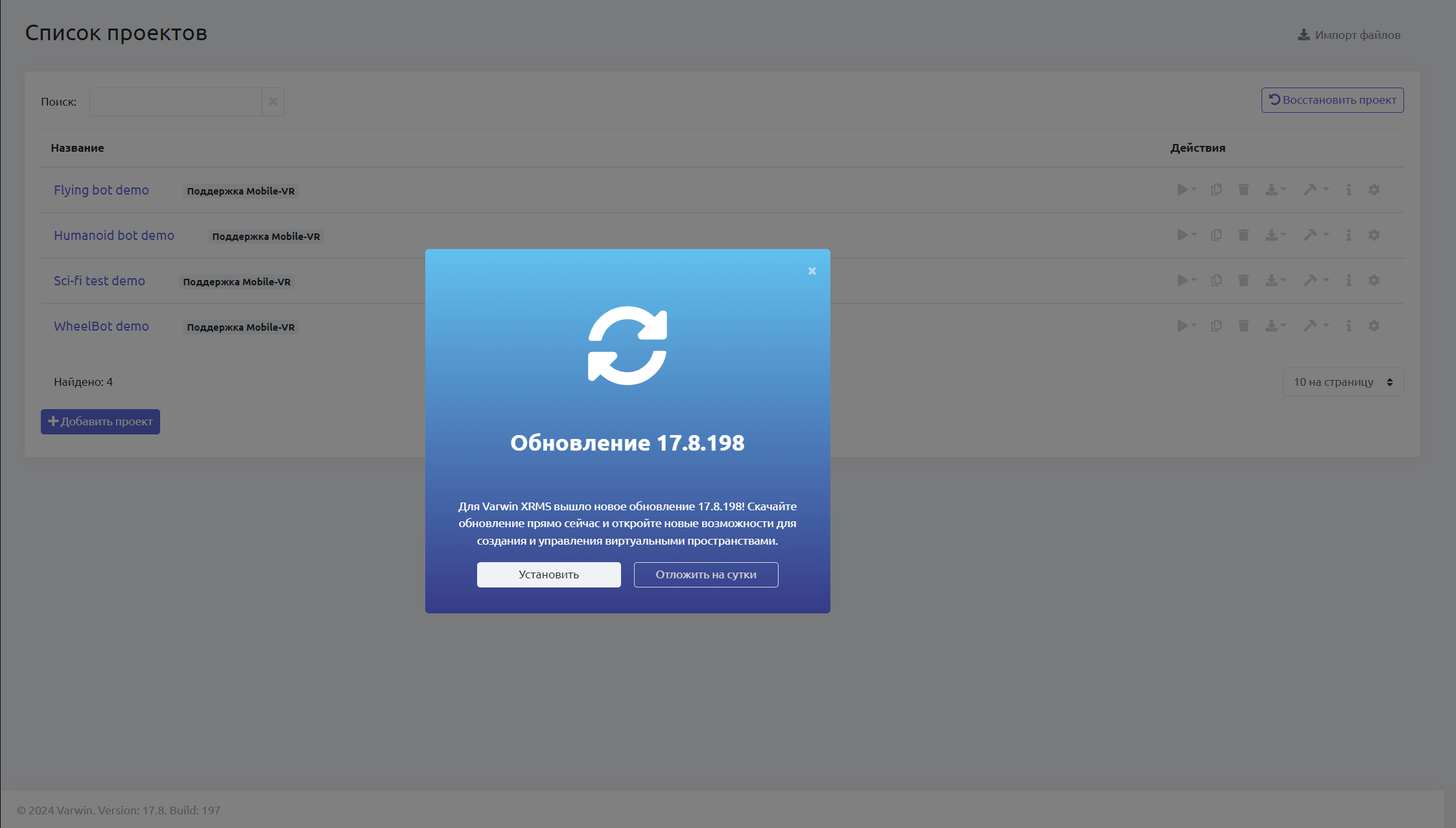 После того, как загрузка завершится, вам нужно будет нажать на кнопку "Перезапустить Varwin для обновления", подробнее вы сможете прочитать в этой статье.