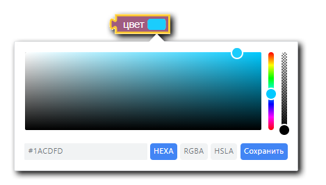 Блок переменной, содержащий в себе параметры цвета в формате HEXA, RGBA, HSLA. При нажатии на окно с цветом, откроется палитра где пользователь может выставить значение параметров цвета в ранее указанных форматах или просто выбрать цвет, указав его на палитре