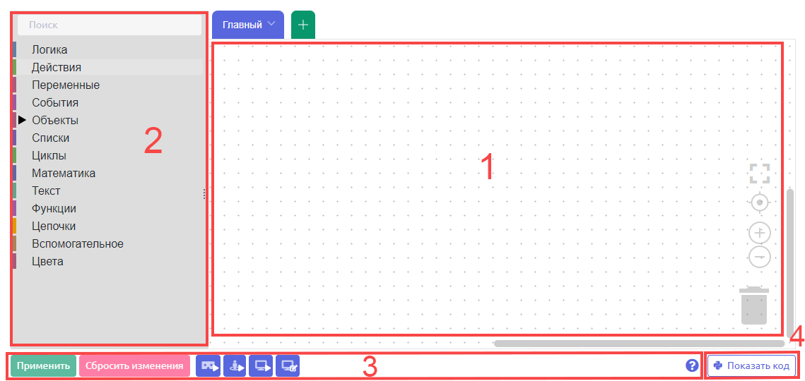 Из блоков, находящихся в библиотеке блоков, собирается сценарий. Все блоки сгруппированы по разделам согласно их назначению: «Логика», «Действия» и т.д.