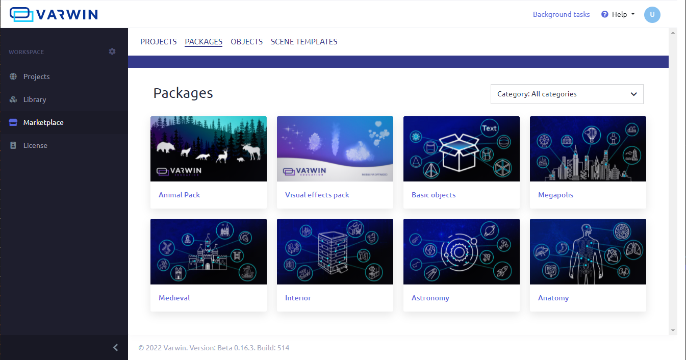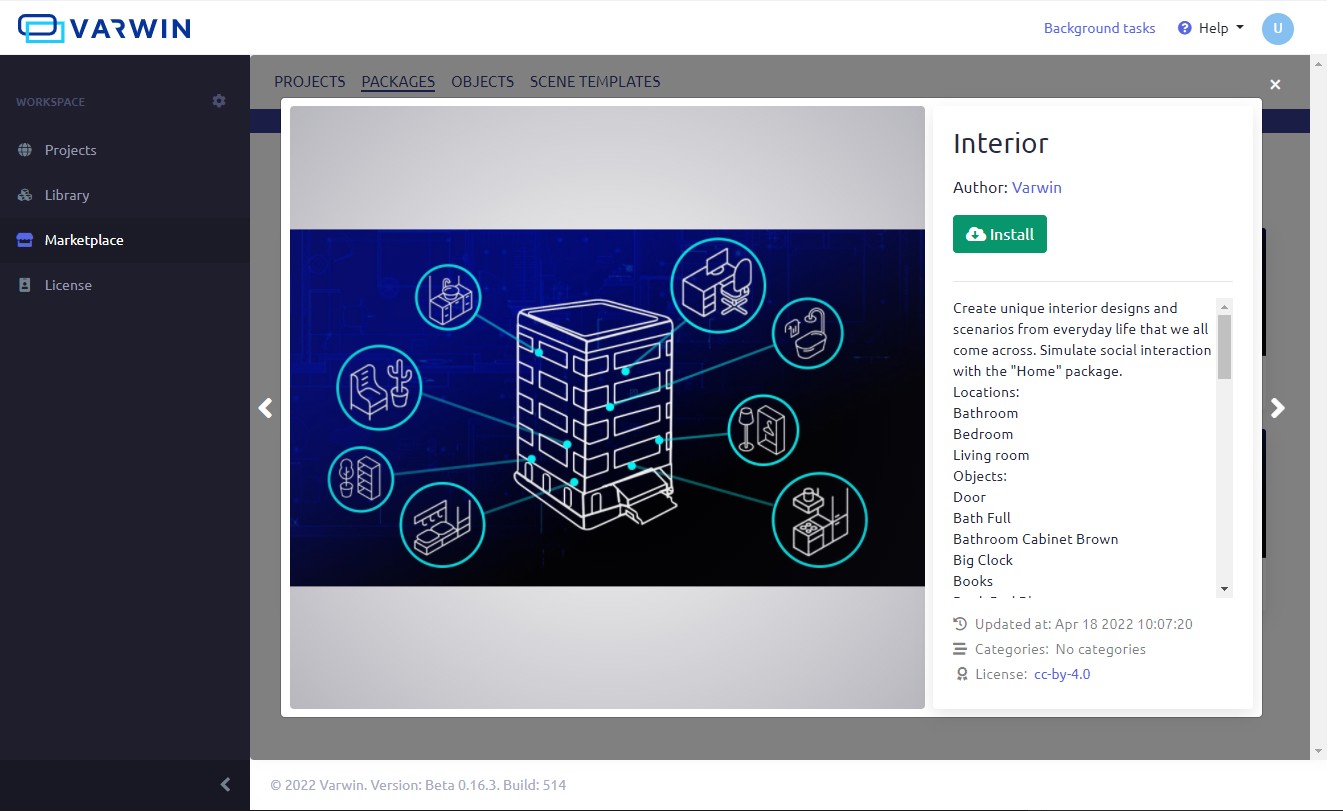 VARWIN DOCS Varwin XRMS Working with content Current: Marketplace Marketplace You can import ready-made projects, packages, objects and scene templates from the MarketplaceGo to the “Marketplace” section to select contentClick on the package you like to install ×