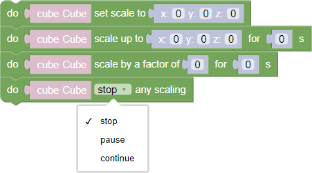 • Close/stop/continue any scaling - blocks controlling object scaling:Finish - block parameter that finishes any scaling of the objectSuspend - block parameter, which suspends object scalingContinue - block parameter that resumes object scaling, which was paused by the Pause block