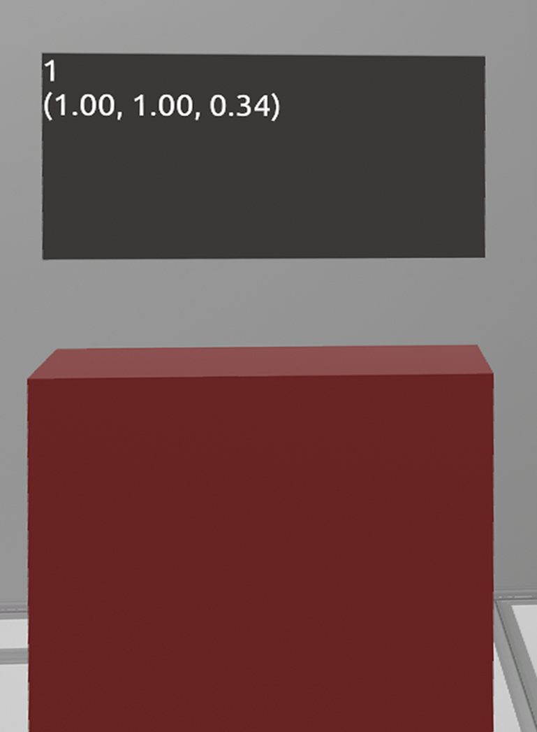 To implement the example, we will use a chain whose update is performed all the time. Let’s put a logical condition inside it, which will be fulfilled if the cube is not scaled. If the condition is true, the values of two parameters will be passed to the “Text” object: