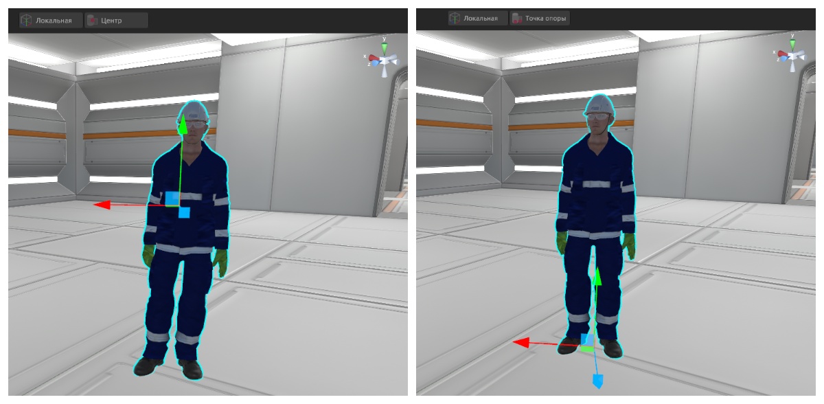 Когда переключатель находится в положении «Точка опоры», объект вращается и перемещается относительно определенной точки, заданной разработчиком