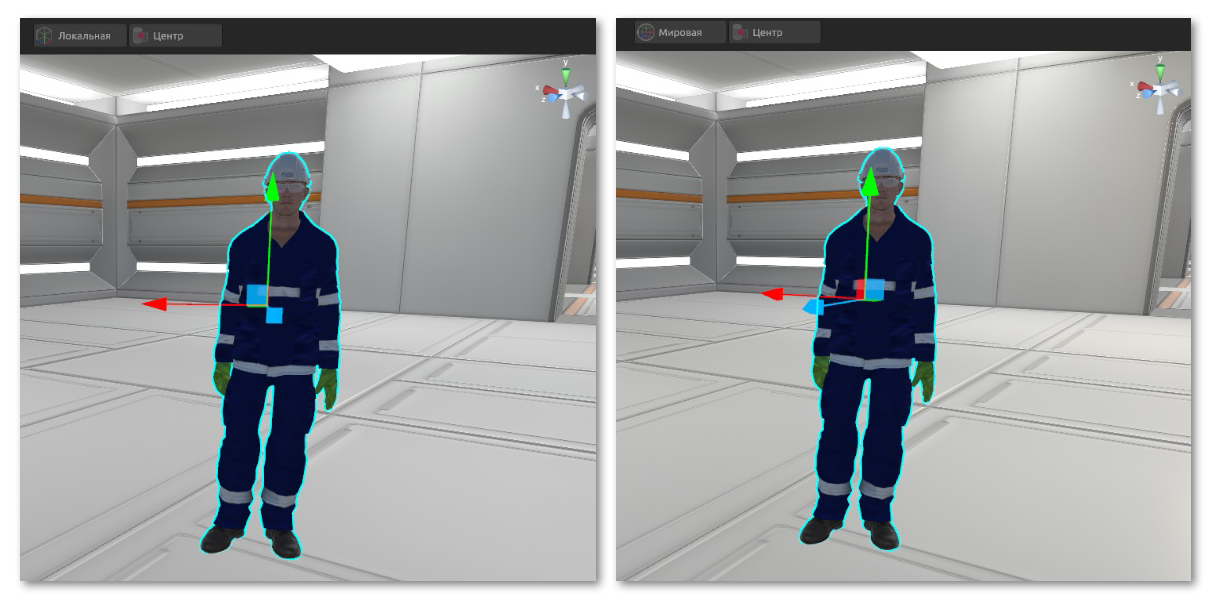 Когда переключатель в положении «Мировая», объект вращается и перемещается относительно осей xyz в мировой системе координат