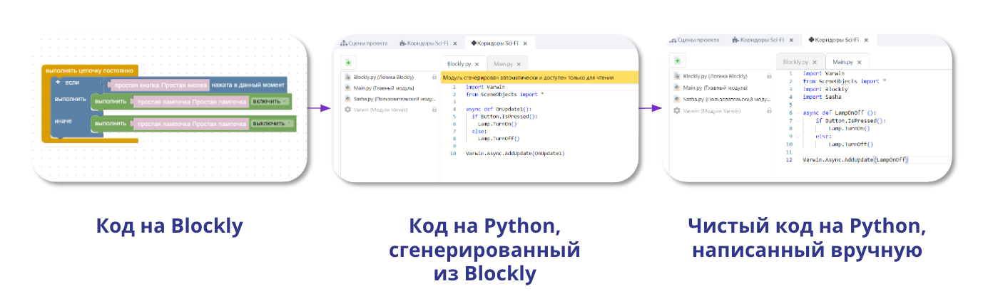 Создавать логику проекта на Blockly, на Python или одновременно на обоих.