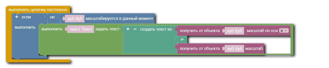 Для реализации примера будем использовать цепочку обновление которой выполняется постоянно. Поместим внутрь неё логическое условие, которое будет выполняться в случае если куб не масштабируется. Если условие верно, то в объект «Текст» будут передаваться значения двух параметров: