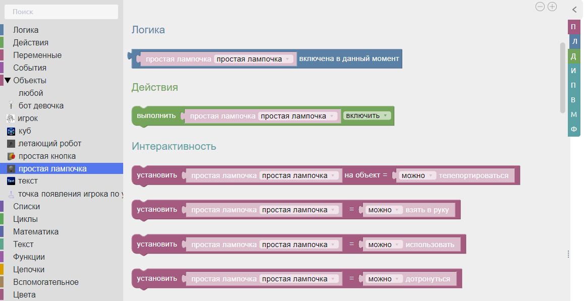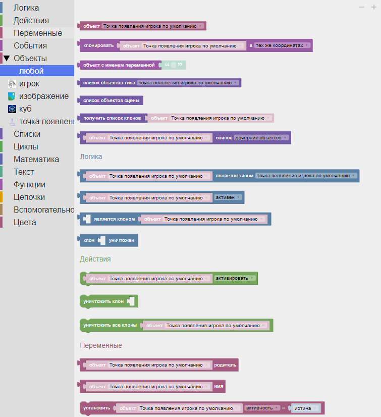 В подразделе «Любой» расположены блоки, универсальные для всех объектов на сцене