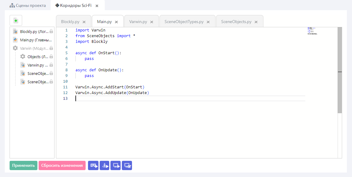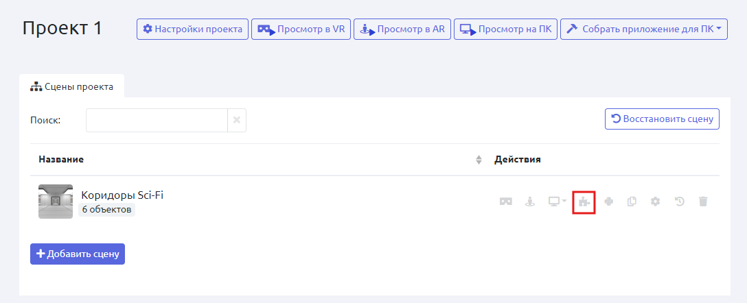 Чтобы открыть визуальный редактор логики сцены, перейдите на страницу проекта и напротив сцены нажмите на иконку пазла