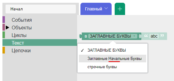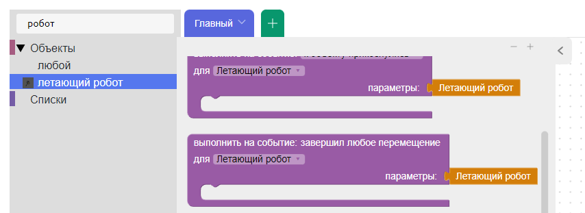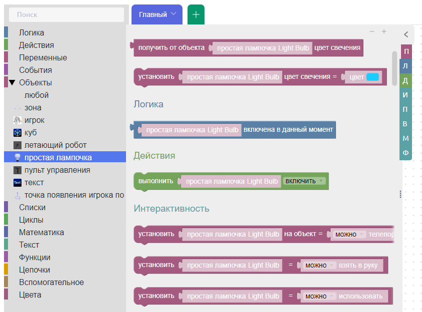 Из блоков, находящихся в библиотеке блоков, собирается сценарий. Все блоки сгруппированы по разделам согласно их назначению: «Логика», «Действия» и т.д.