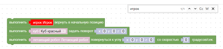 В редакторе логики присутствует поиск блоков по объектам в рабочей области, находящихся на сцене. Для его вызова, необходимо нажать комбинацию клавиш Ctrl + F