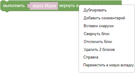 При нажатии на блок правой кнопкой мыши открывается контекстное меню блока, позволяющее:
