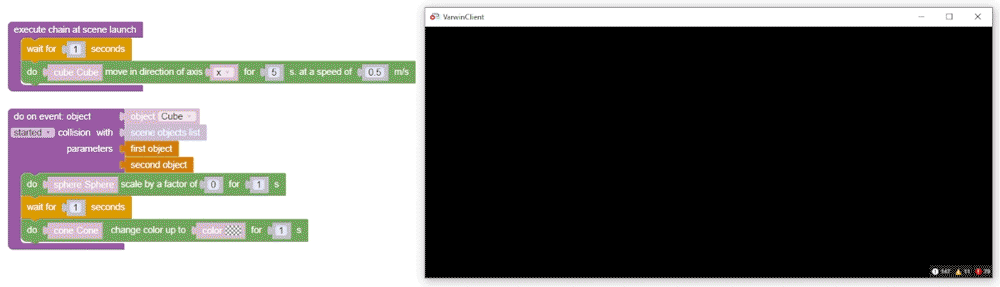 - Блок события, включающий в себя конструкцию из блоков действия над тремя объектами: конусом, кубом и сферой